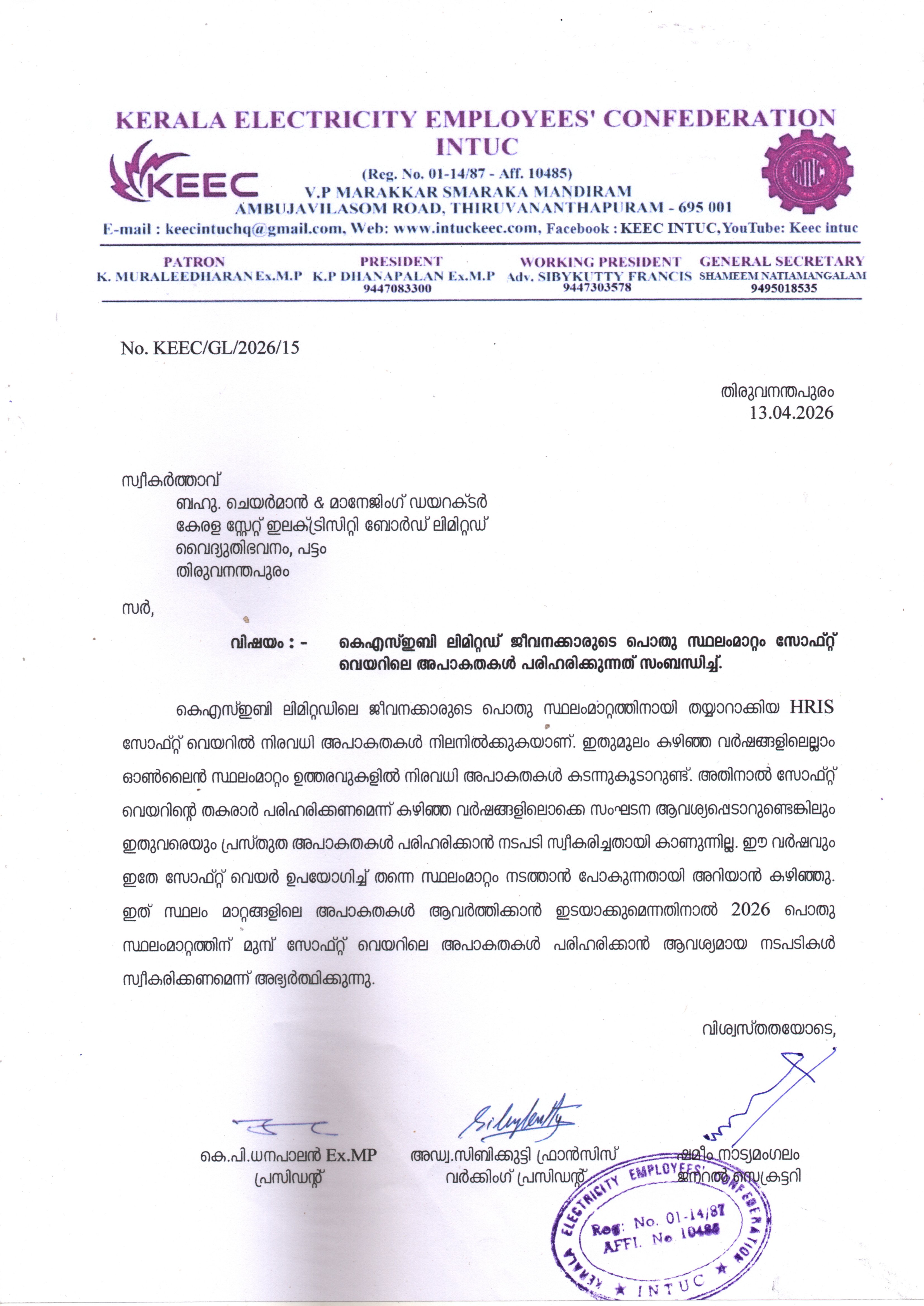 KSEBL ജീവനക്കാരുടെ പൊതു സ്ഥലം മാറ്റം സോഫ്റ്റ് വെയറിലെ അപാകതകൾ പരിഹരിക്കുന്നത് സംബന്ധിച്ച് ബഹു.ചെയർമാൻ & മാനേജിങ് ഡയറക്ടർക്ക് 13.4.2026 നു നൽകിയ കത്ത്.