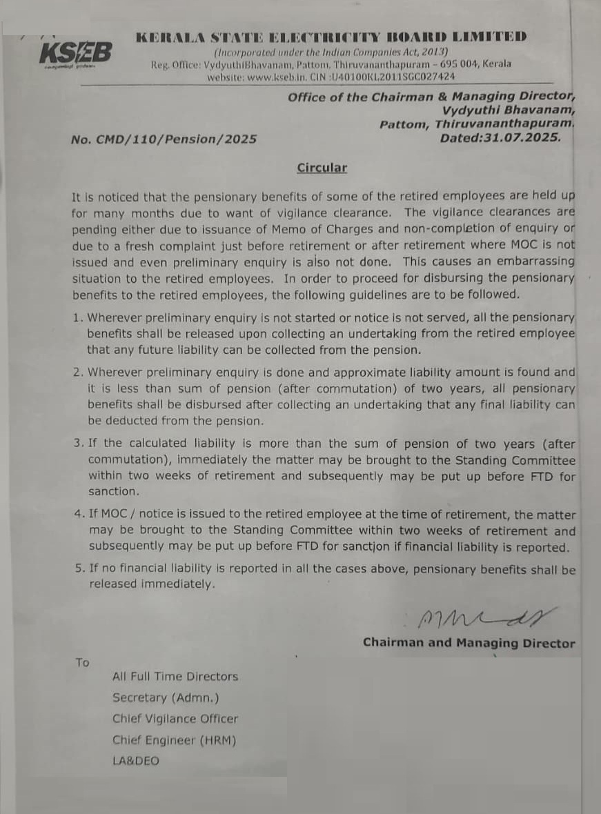 Regarding the authentication of the certificate submitted annually to the Pension Disbursing Authority by those receiving service pension from KSEB who have resided abroad